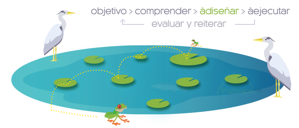 Miremos nuestro salto y nuestro objetivo mayor. La rana quiere saltar al otro lado del estanque, porque vio otra rana simpática que quiere conocer. ¿Qué debe hacer? ¿Cuál debe ser su estrategia?